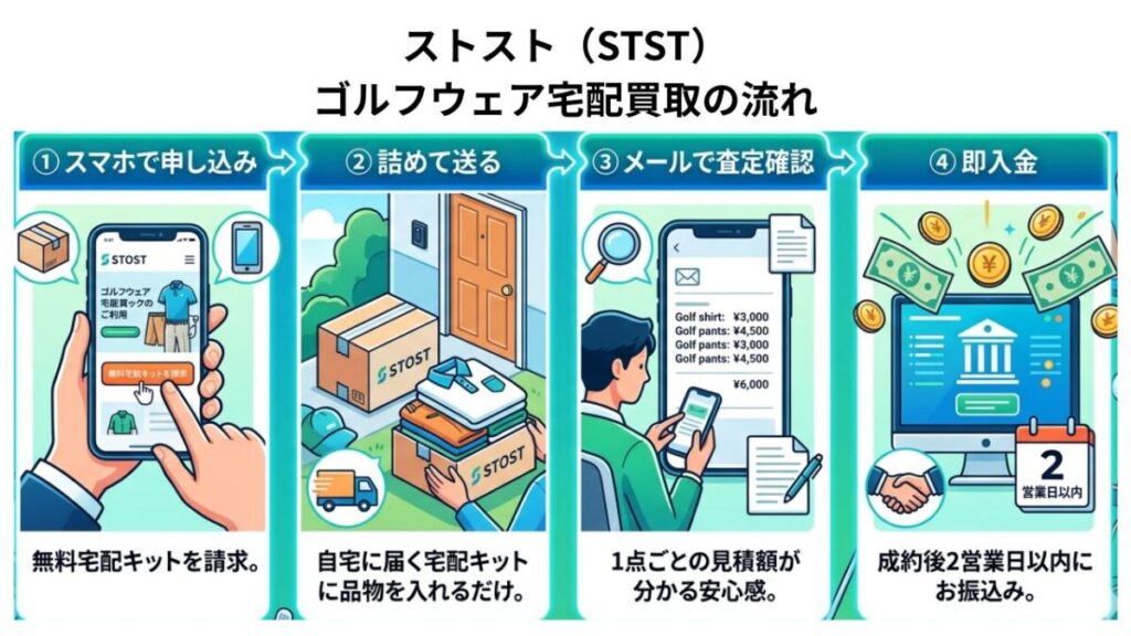 ゴルフウェア買取「ストスト」の大きな魅力は、家から一歩も出ることなく、すべての手続きがスマホと自宅への集荷だけで完結する手軽さにあります。